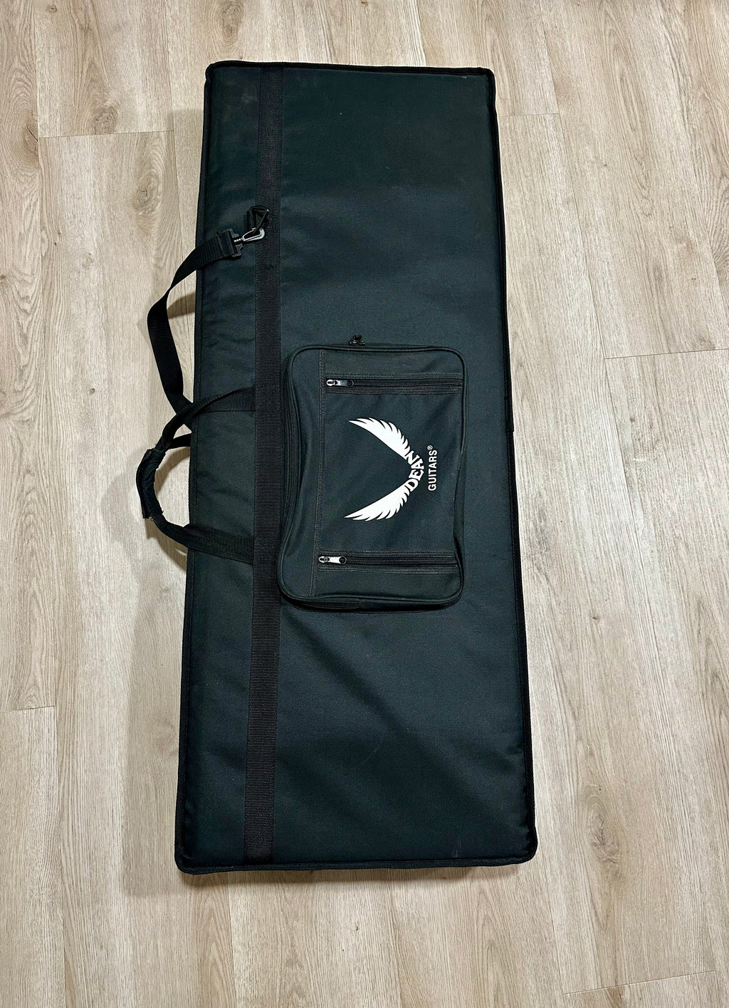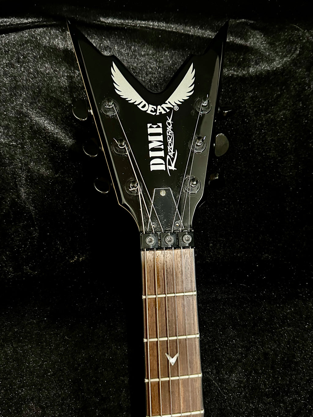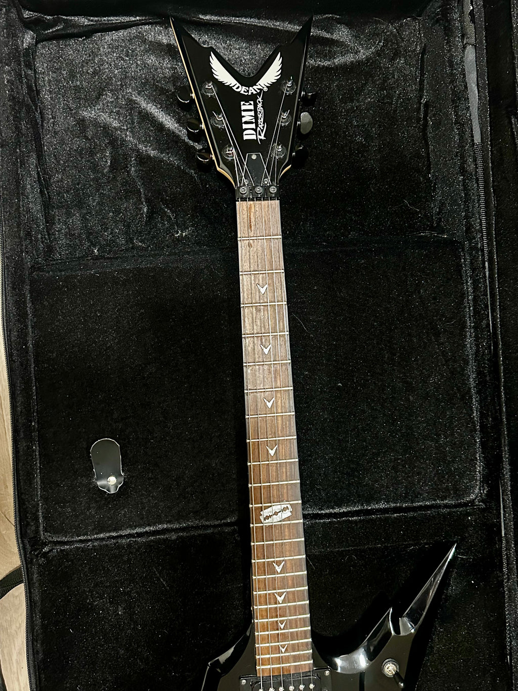 Normal wear and some scratches on top. Frets some wear but ok. Good playing ability and set up very good. Sharp edges clean and good condition. New DR-strings and setup for Dimebag tuning. Discontinued model and rare find with Dime logo on headstock. Floyd Rose Special equipped tremolo system. Dean lightweight hardcase clean and good condition. Get Your Wings!